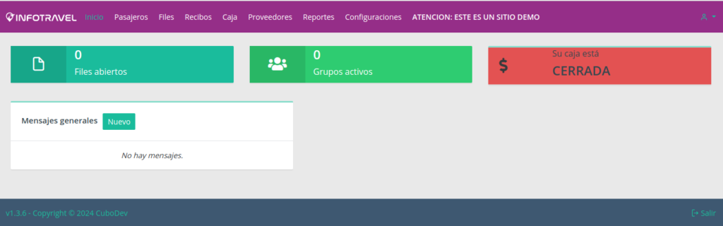 3) Tres cajas de estado que indican: los files abiertos, los grupos activos y si el estado de la caja del usuario (este panel se actualiza automáticamente).